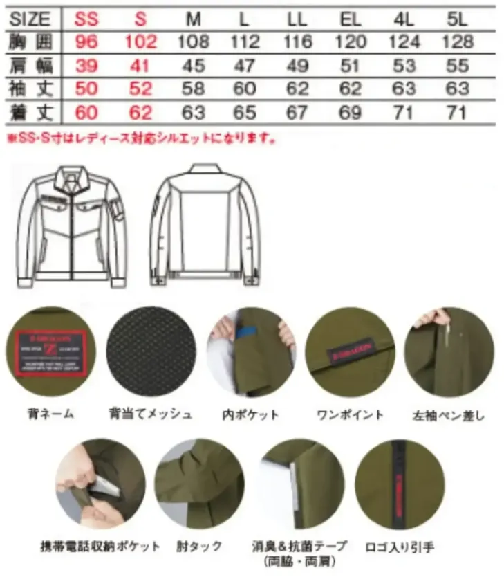 ■形状特長背当てメッシュ|内ポケット|左袖ペン差し|携帯電話収納ポケット|肘タック|消臭&抗菌テープ(両脇・両肩)