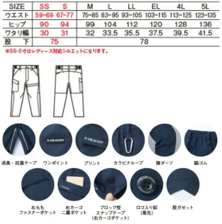 ■形状特長消臭・抗菌テープ|カラビナループ|膝ダーツ|脇ゴム|左ももファスナーポケット|右カーゴ二重ポケット|股ガゼット
