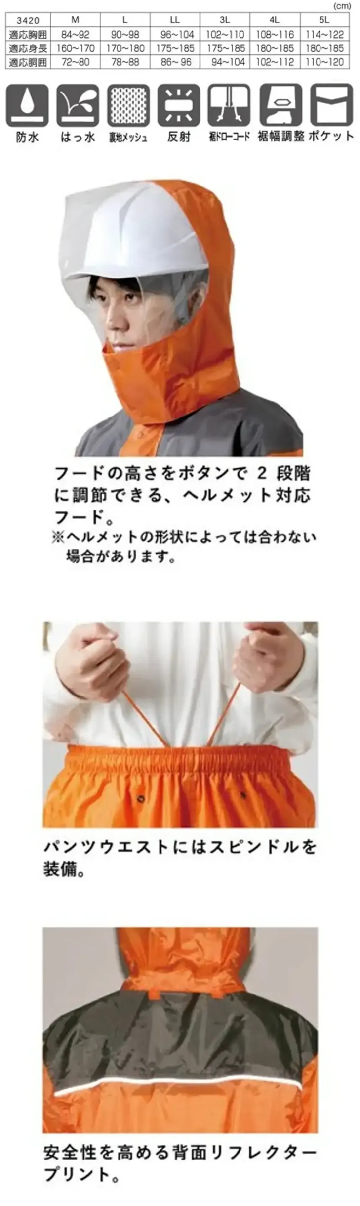 ■形状特長ヘルメット対応フード・パンツウエストスピンドル仕様・裾ドローコード・裾幅調整・背面リフレクタープリント