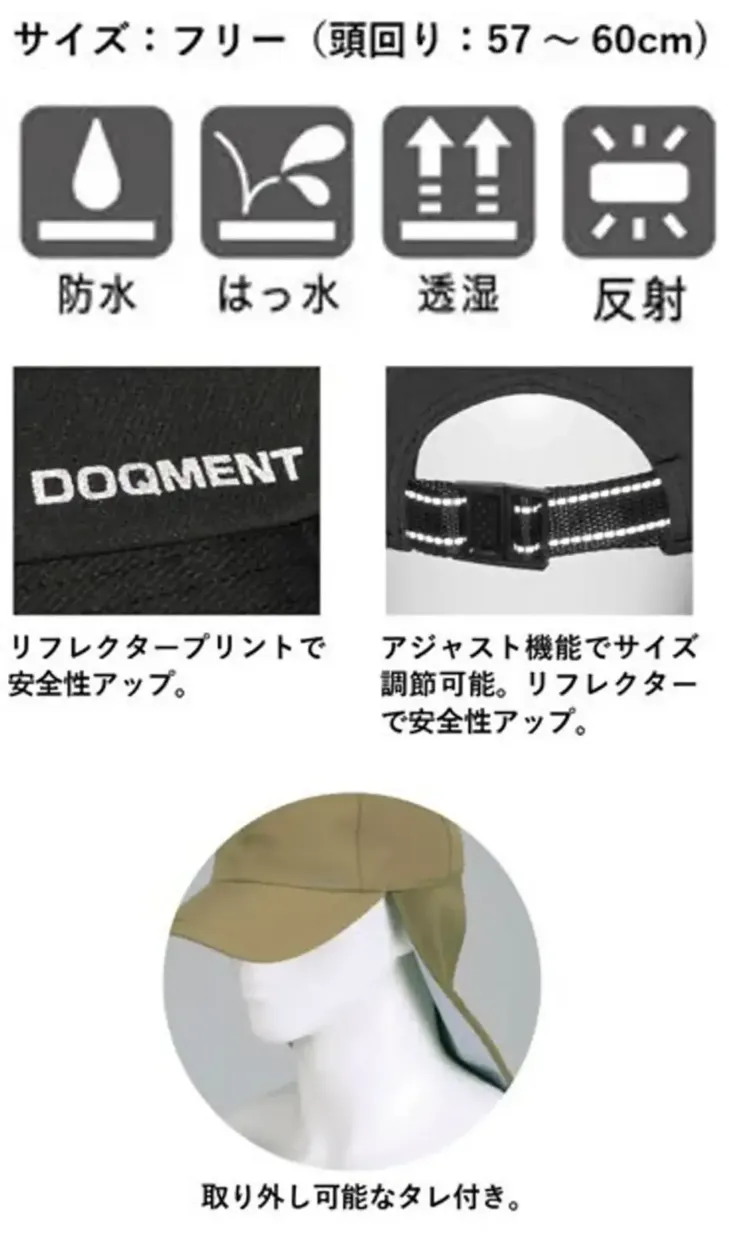突然の雨でも快適に過ごせる防水キャップ。軽量でしなやかなポリエステル生地にTPUラミネート加工を施し、高い防水性とはっ水性を実現しました。取り外し可能なタレ付きで、首元までしっかりガード。夜間や悪天候下でも安心のリフレクタープリントを採用し、安全性も確保。アジャスターでサイズ調整も可能な、全天候対応の高機能キャップです。