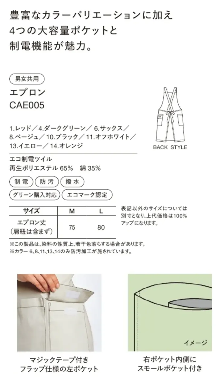■素材特長グリーン購入対応 エコマーク認定 制電 防汚 撥水(6 サックス、8 ベージュ、11 オフホワイト、13 イエロー、14 オレンジ) タンブラー乾燥禁止 ※取り扱い上のご注意※洗濯時は必ずネットを使用※漂白剤・タンブラー乾燥は避けてください