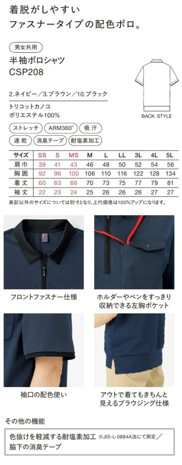 半袖ポロシャツ ハンズオンCSP208のサイズ表