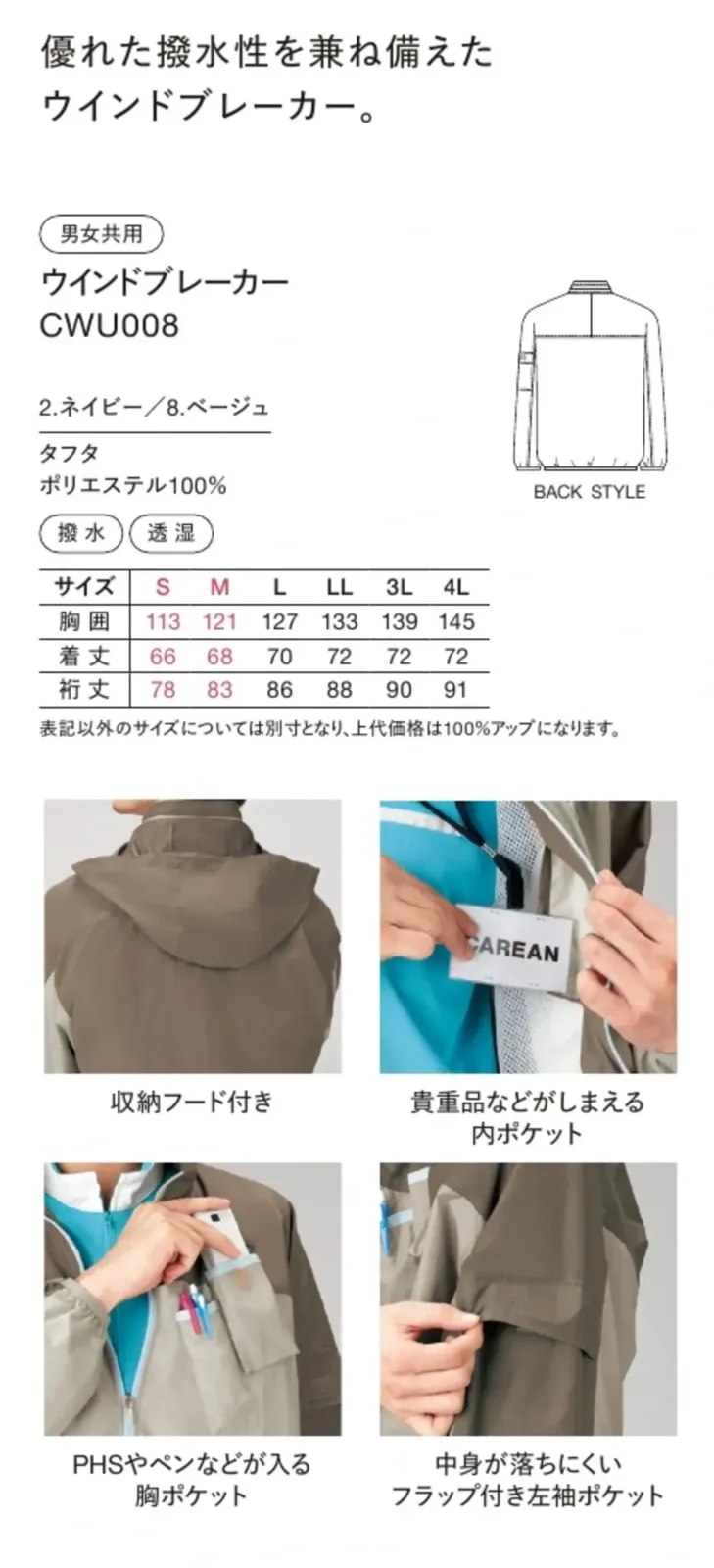 ウインドブレーカー ハンズオンCWU008のサイズ表