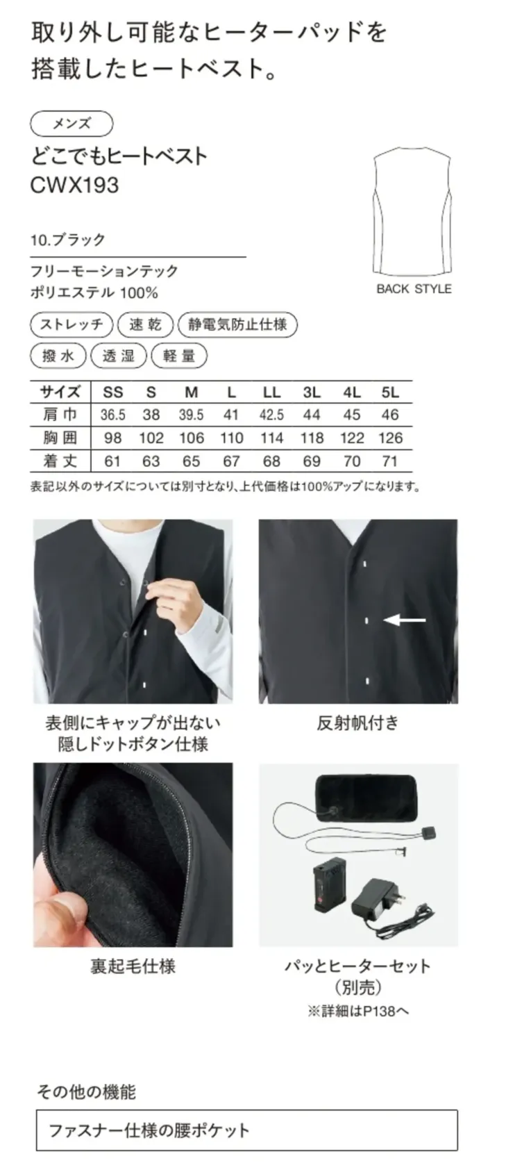 どこでもヒートベスト ハンズオンCWX193のサイズ表