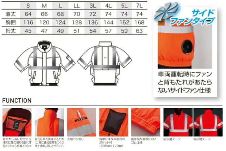 車両速度60km以下の一般道路で作業する作業者や交通警備・公共事業・配送業務などに対応した高視認反射半袖ジャンパー。電動ファン対応で熱中症対策にも有効。オレンジカラーはJIS T-8127 高視認性安全服 クラス2を取得しています。