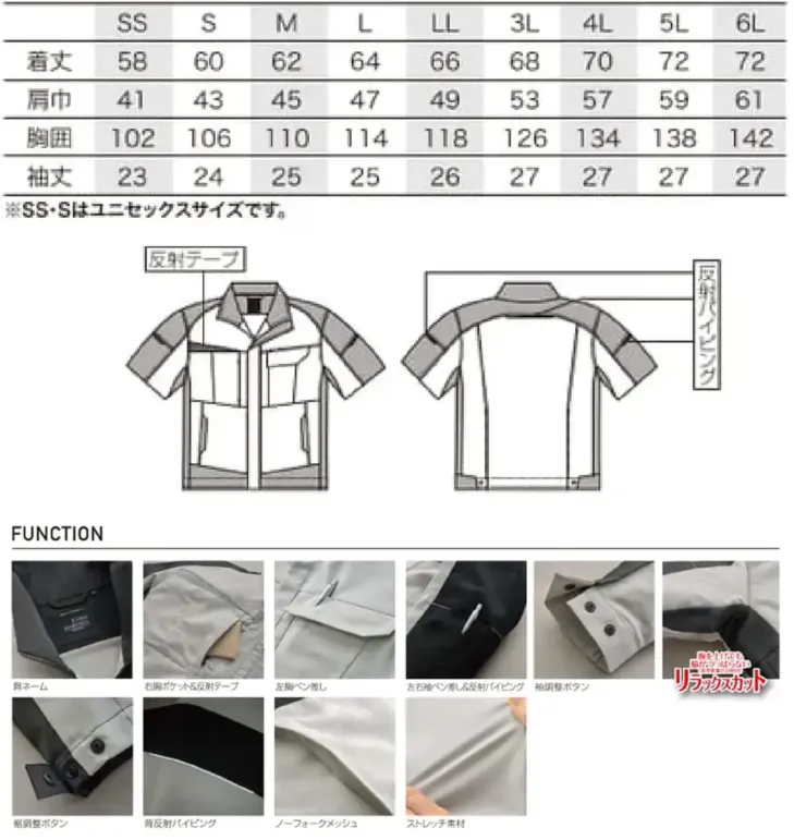 ■形状特長右胸ポケット 左胸ペン差し 左右袖ペン差し 裾調整ボタン リラックスカット ノーフォークメッシュ 反射素材配置