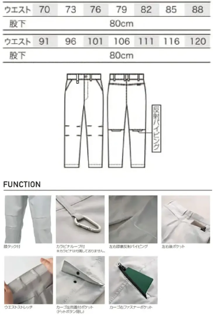 ■形状特長ノータック 膝タック カラビナループ 左右膝裏反射パイピング 左右後ポケット ウエストストレッチ