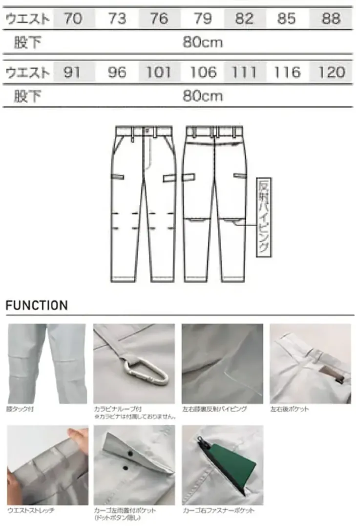 ■形状特長カーゴ左雨蓋付ポケット(ドットボタン隠し) カーゴ右ファスナーポケット ノータック 膝タック カラビナループ 左右膝裏反射パイピング 左右後ポケット ウエストストレッチ