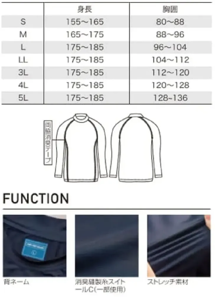 接触冷感素材を採用した作業用長袖アンダーウェアです。優れたストレッチ性と吸汗速乾性に加え、消臭縫製糸スイトールC®を一部使用。汗ばむ季節の作業でも快適な着心地を保ち、インナーとして働く人の動きをしっかりサポートします。