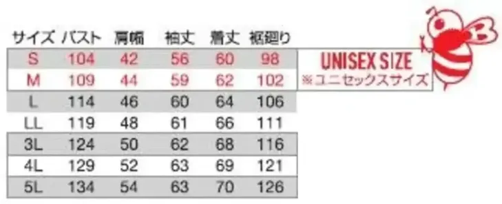 ジャケット(ユニセックス) バートル9721のサイズ表