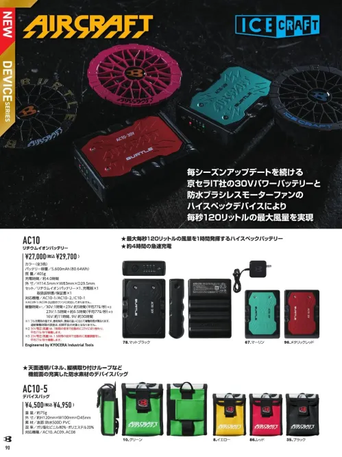 毎シーズンアップデートを続ける京セラIT社の30Vパワーバッテリー。AIRCRAFTシリーズ対応の高出力30VリチウムイオンバッテリーAC10。最大毎秒120リットルの風量を1時間発揮するハイスペック設計で、約4時間の急速充電に対応。