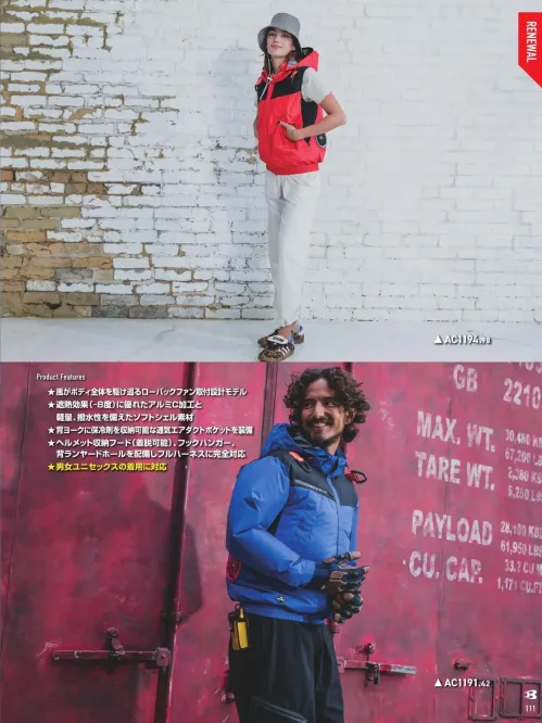 ■形状特長ローバックファン取付設計 ヘルメット対応着脱式フード(前後スピンドル付き・ボタン止め着脱仕様) エアダクトポケット ランヤードホール フルハーネス対応 袖ペンポケット 両脇ポケット バッテリーポケット カフスアジャスター ハーネス用フックハンガー