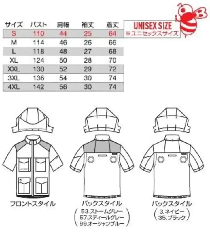 AC半袖ブルゾン(ユニセックス)(デバイス別売) バートルAC2106のサイズ表