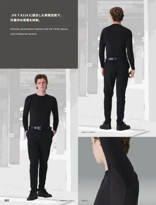 ・JIS T8118適合の制電性能で作業中の帯電を抑制