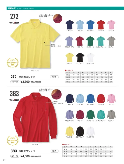 半袖ポロシャツ 小倉屋272-Aのサイズ表