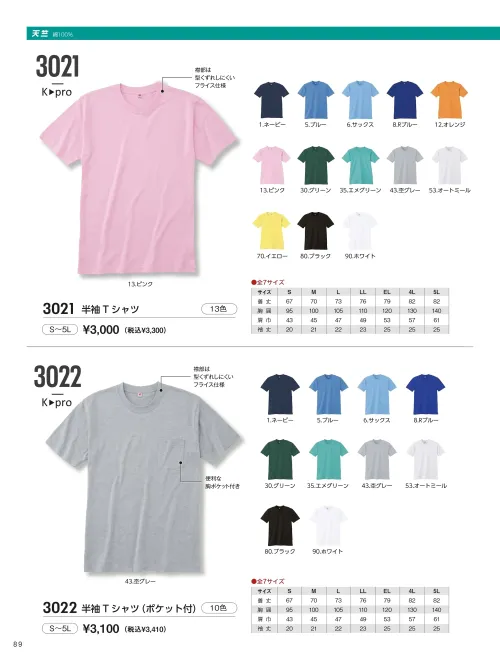 半袖Tシャツ 小倉屋3021-Aのサイズ表