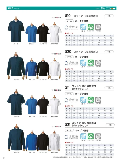 コットン100長袖ポロ(ポケットなし) 小倉屋521のサイズ表