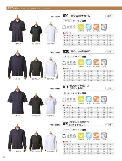BIOcorm長袖ポロ 小倉屋820のサイズ表
