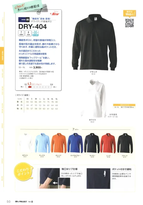 機能性ポロに、待望の長袖が仲間入り。長袖が肌の露出を防ぎ、擦れや寒さから守ります。作業に便利なポケット付き。糸の選定までこだわったm'sオリジナルの特選素材使用。特殊断面糸トップクールを使い、優れた吸汗速乾性を発揮!繰り返しの洗濯でも吸水性が持続します。