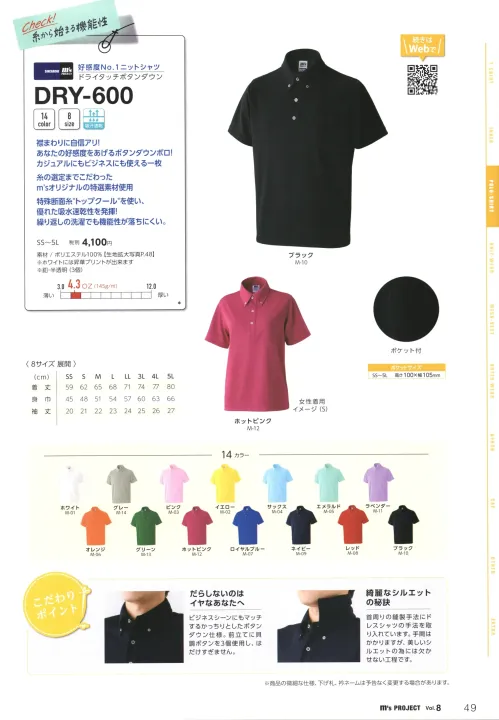ドライタッチボタンダウンニットシャツ マスダDRY-600-Bのサイズ表