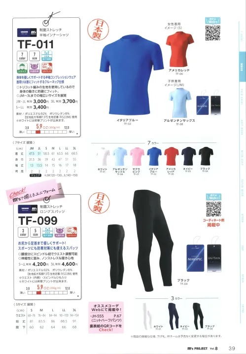 制菌ストレッチロングスパッツ マスダTF-099のサイズ表