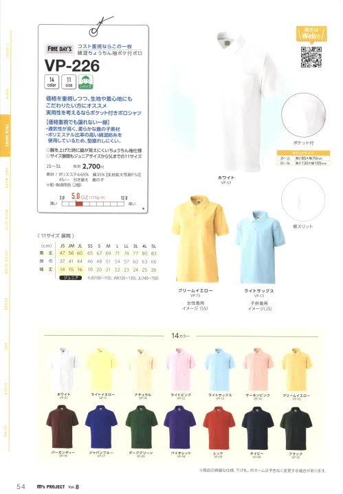T/Cちょうちん袖ポロシャツ マスダVP-226のサイズ表