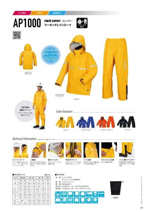 ワーキングレインスーツ(3レイヤー)(上下セット) 前垣AP-1000のサイズ表