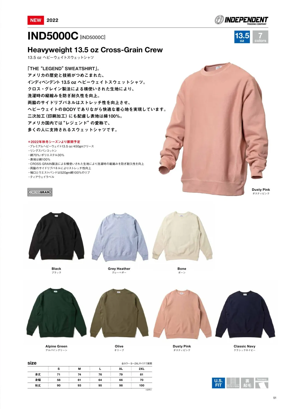 13.5oz ヘビーウェイトスウェットシャツ American StyleIND5000Cのサイズ表