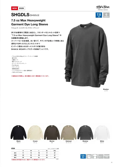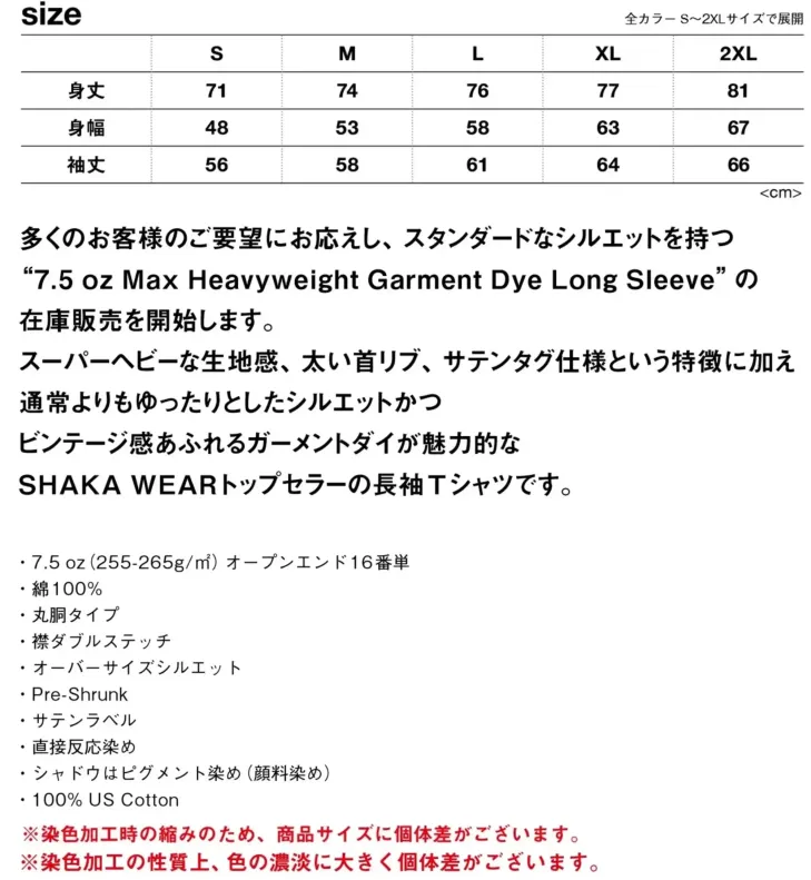 7.5oz ガーメントダイ ロングスリーブTシャツ American StyleSHGDLSのサイズ表