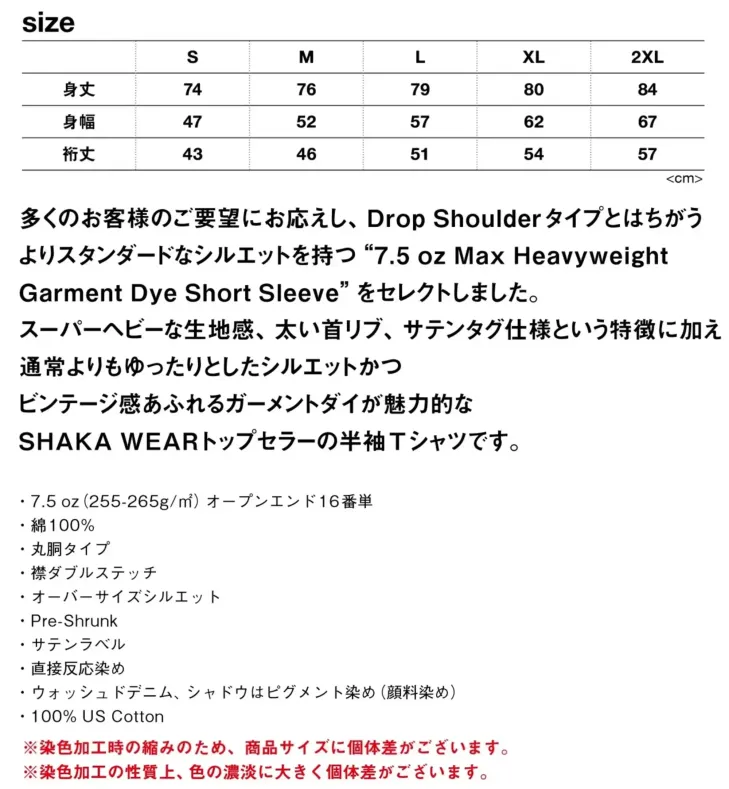 7.5oz ガーメントダイ Tシャツ American StyleSHGDSS-Aのサイズ表