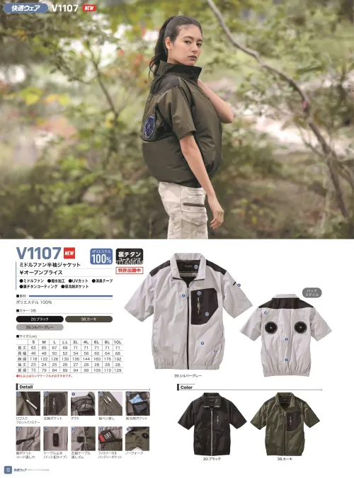 ■形状特長ミドルファン仕様・ロゴ入りフロントファスナー・左胸ポケット・左袖ペン差し・保冷剤ポケット・ケーブル通し・バッテリーポケット・ノーフォーク・消臭テープ付き・ダクト