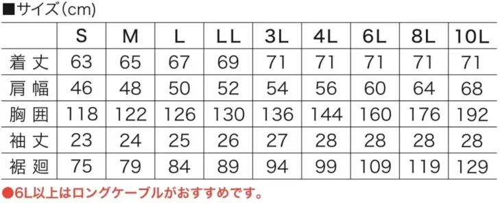 ミドルファン半袖ジャケット(ファン・バッテリー・保冷剤別売) 村上被服V1107のサイズ表