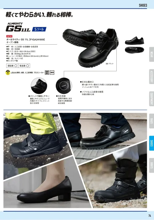■形状特長硬質樹脂先芯入り・踵部衝撃吸収性 耐滑性・再帰反射材付き・JSAA A種認定(普通作業用)・内側スリット加工・セメント製法・買い替え目安のスリップサイン(2ヶ所)