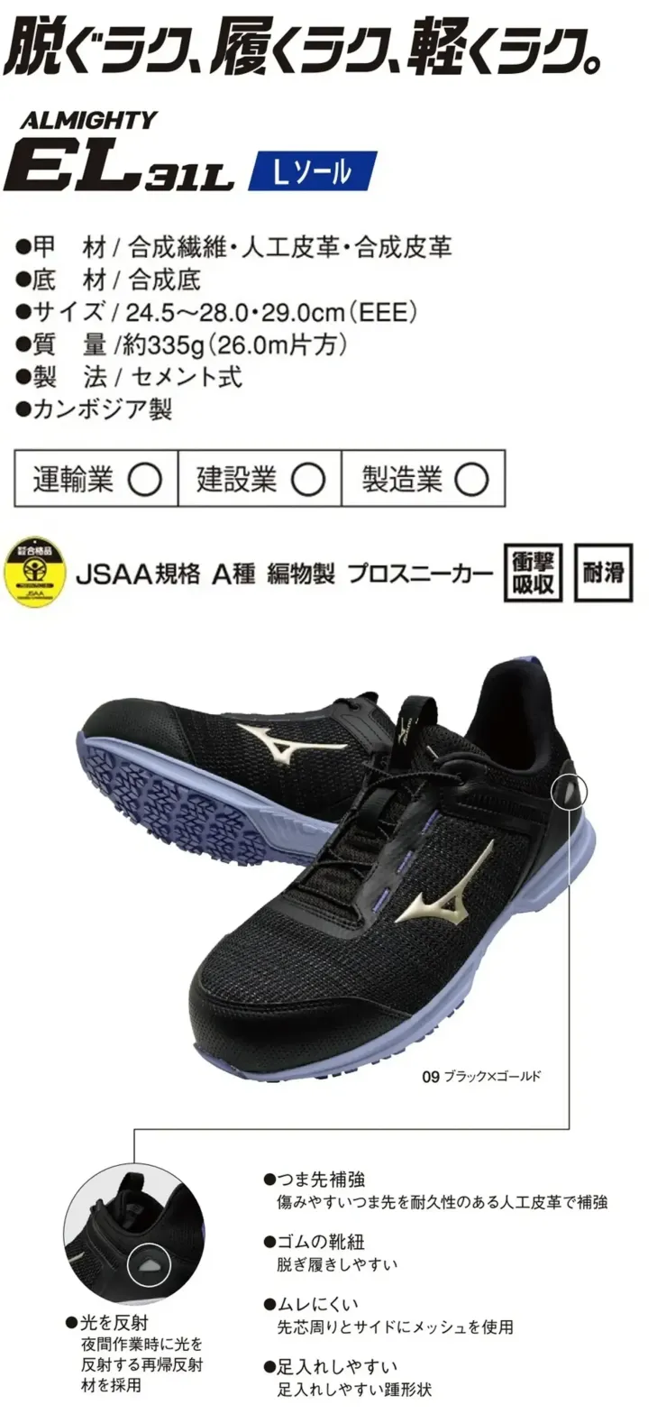 ■形状特長Lソール・ゴム靴紐・つま先補強・硬質樹脂先芯入り・踵部衝撃吸収性と耐滑性・買い替え目安のスリップサイン付き(2ヶ所)・JSAA A種認定(普通作業用)・再帰反射材使用・セメント製法