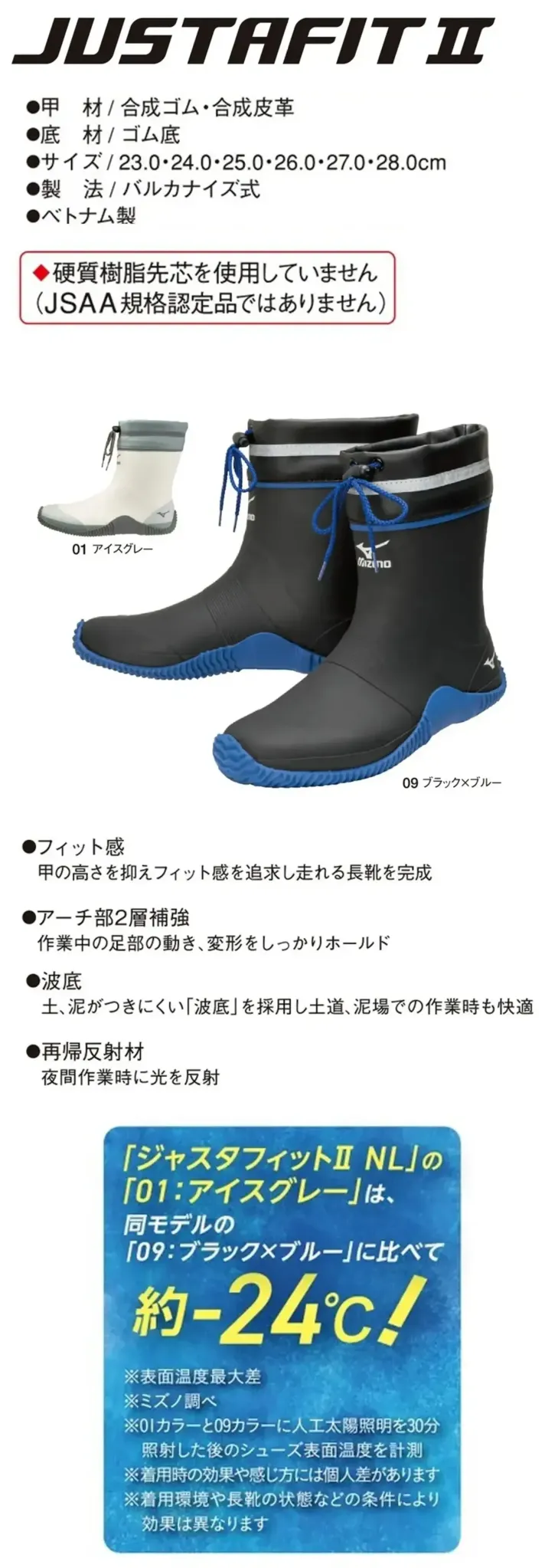 ■形状特長ショート丈・アーチ部2層補強・波底ソール・フィット設計・再帰反射材・履き口調整コード付き