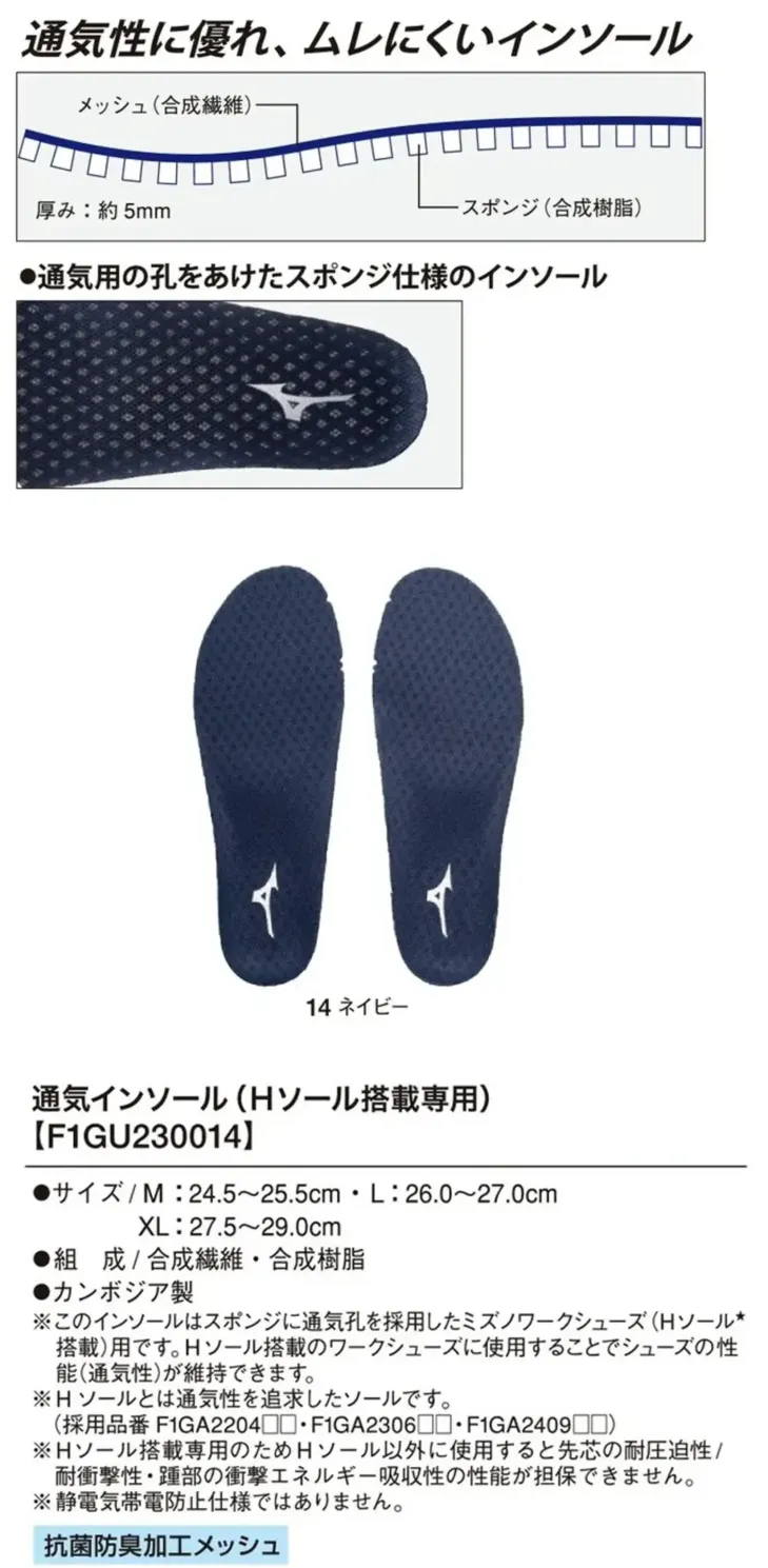 通気性と快適性を追求したミズノワークシューズ(Hソール搭載)専用インソールです。スポンジに通気孔を設けた構造と抗菌防臭加工メッシュにより、ムレを抑えて清潔に保ちます。Hソール搭載モデルに使用することで、シューズ本来の通気性能を最大限に発揮します。
