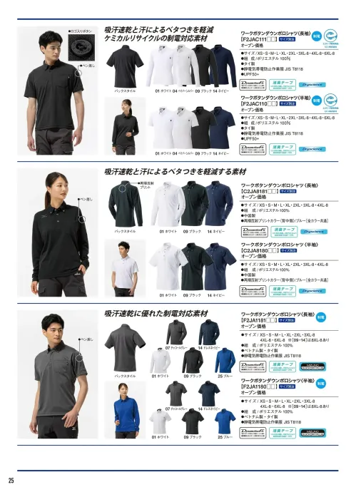 ■素材特長ドライな着心地Dryscience・吸汗速乾・制電(静電気帯電防止作業服 JIS T8118)・UVカット(UPF50+)・エコマーク認定商品・リサイクル素材