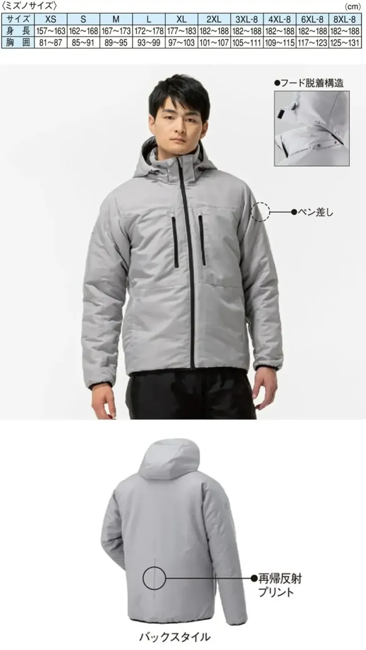 ■形状特長フード着脱式・両胸ファスナー付き縦ポケット・左袖ペン差し・背面再帰反射プリント・ダイナモーションフィット
