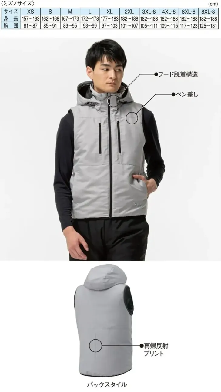 ブレスサーモ中綿ベスト ミズノF2JE1586のサイズ表