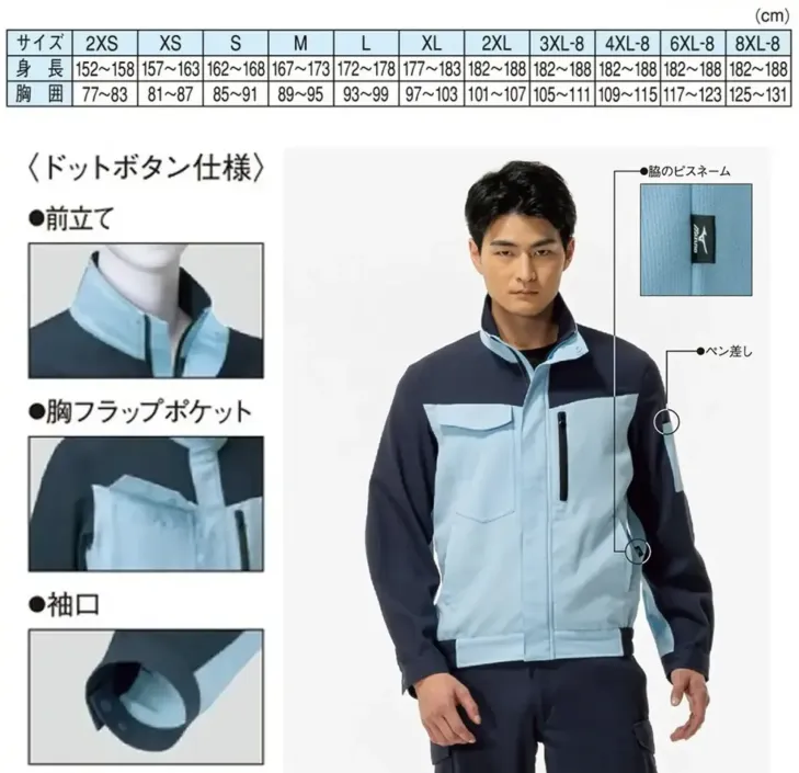 ■形状特長左胸ファスナーポケット・右胸フラップポケット・左袖ペン差し・ドットボタン仕様(前立て・胸フラップポケット・袖口)