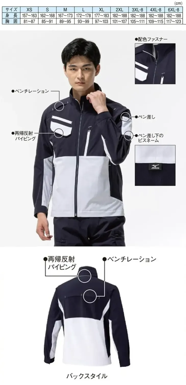 ■形状特長右胸フラップポケット・配色ファスナー・ベンチレーション・再帰反射パイピング・左袖ペン差し・体のラインに沿った細身のシルエット・消臭テープ・ワークシーンの動きに特化したダイナモーションフィット