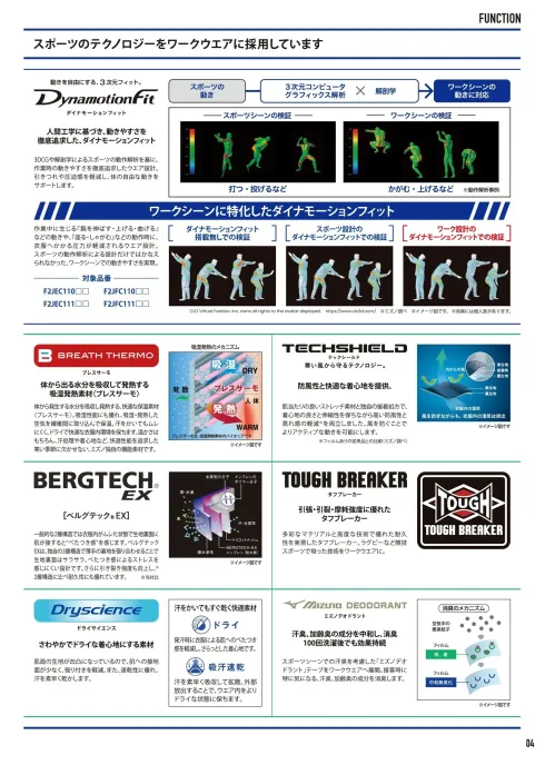 ■形状特長フルハーネス対応・ランヤード取り出し口・ファン脱落防止ネット・D環付き・Quick Free®ファスナー・ミズノデオドラントテープ(消臭テープ)・ファスナーポケット・ペン差し・両脇逆玉縁ポケット・再帰反射プリント・ダイナモーションフィット