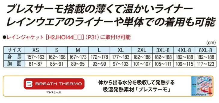 ミズノの吸湿発熱素材〈ブレスサーモ〉を採用したライナーシャツ。体から出る水分を吸収して発熱することで、薄手ながらもしっかり暖かい。レインウェア〈H2JHOI44〉への取付が可能で、単体での着用もできる汎用性の高いインナージャケットです。