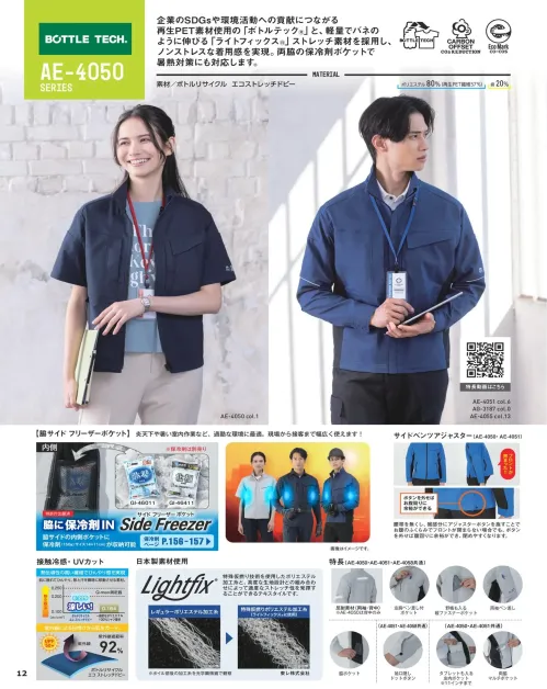 企業のSDGsや環境活動への貢献につながる再生PET素材を使用したエコ・ストレッチ長袖ブルゾン。ポリエステル80%再生繊維約57%の環境配慮素材に加え、約20%のヨコ伸びストレッチで軽やかな着心地を実現。サイドフリーザーポケットで保冷剤を収納でき、暑熱環境でも快適な作業をサポートします。
