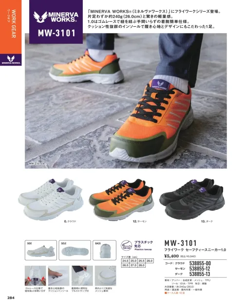 MINERVA WORKS®のフライワークシリーズから登場した軽量セーフティースニーカー。片足約240gの超軽量設計とゴムレース仕様でスムーズな着脱を実現。クッション性に優れたソールが足への負担を軽減し、軽作業から日常使いまで快適な履き心地を提供します。