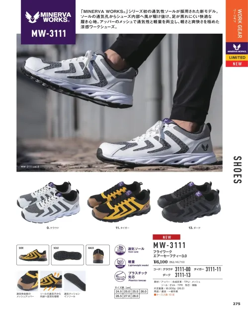 MINERVA WORKS®シリーズ初の通気性ソールが採用された新モデル。ソールの通気孔からシューズ内部へ風が駆け抜け、足が蒸れにくい快適な履き心地。アッパーのメッシュで通気性と軽量を両立し、軽さと爽快さを極めた涼感ワークシューズ。