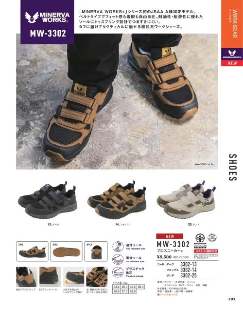 MINERVA WORKS®シリーズ初のJSAA A種認定を取得した高機能セーフティースニーカー。面ファスナー仕様で着脱がスムーズかつ確実なフィット感を実現。耐油性・耐滑性に優れたソールとトゥスプリング設計によりつまずきを軽減し、現場作業を安全かつ快適にサポートします。