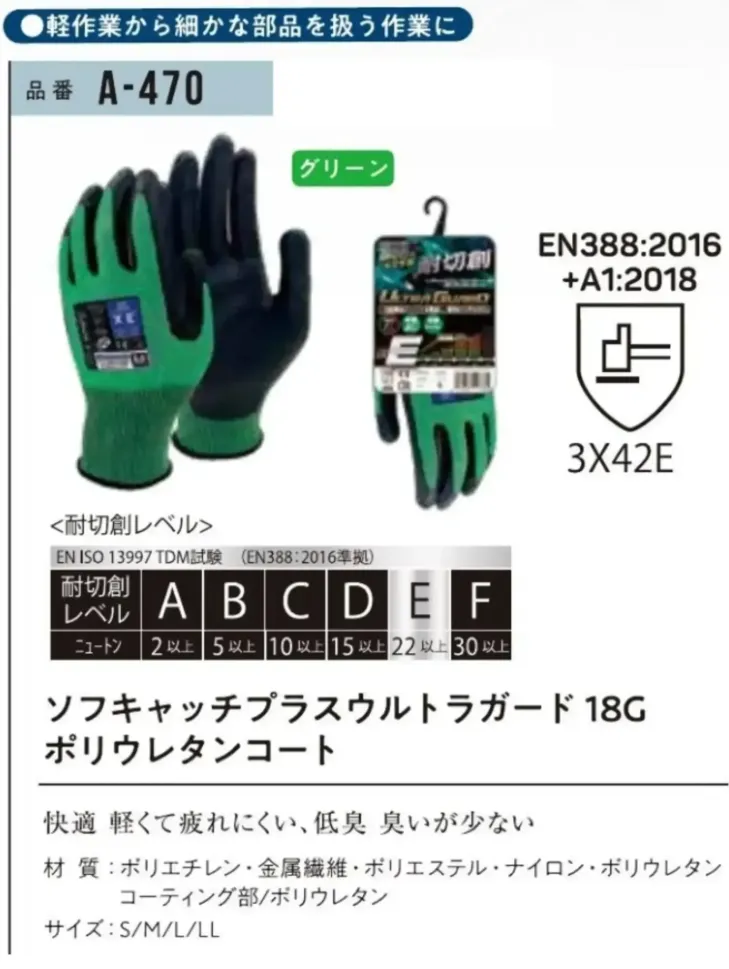 ■素材特長耐切創性レベルE・軽量・疲れにくい・低臭・臭いが少ない・EN388:2016+A1:2018規格「3X42E」