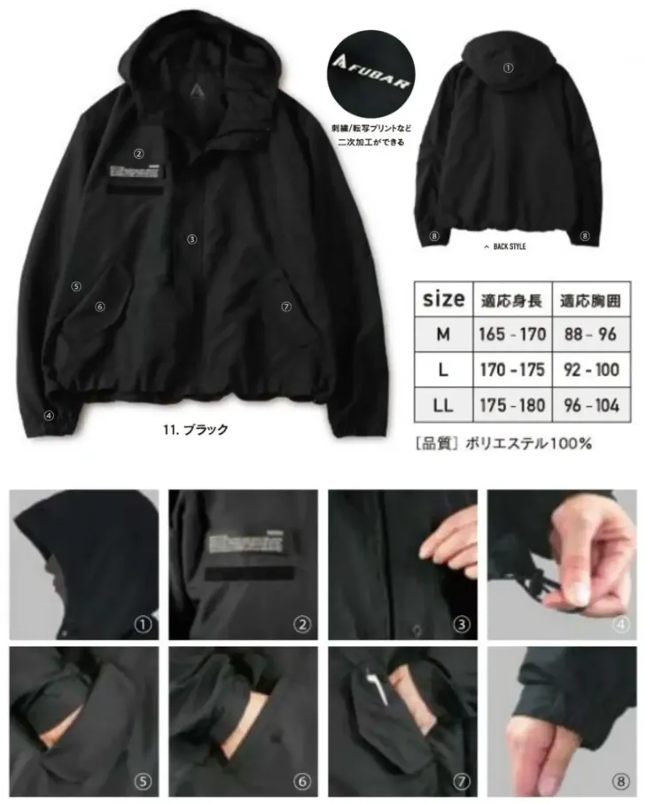 ■形状特長オーバーサイズ・ショート丈・ドローコード付きフード・着脱可能ワッペン・裾部ドローコード・サイドポケット・左脇ペン挿し・袖口半リブ