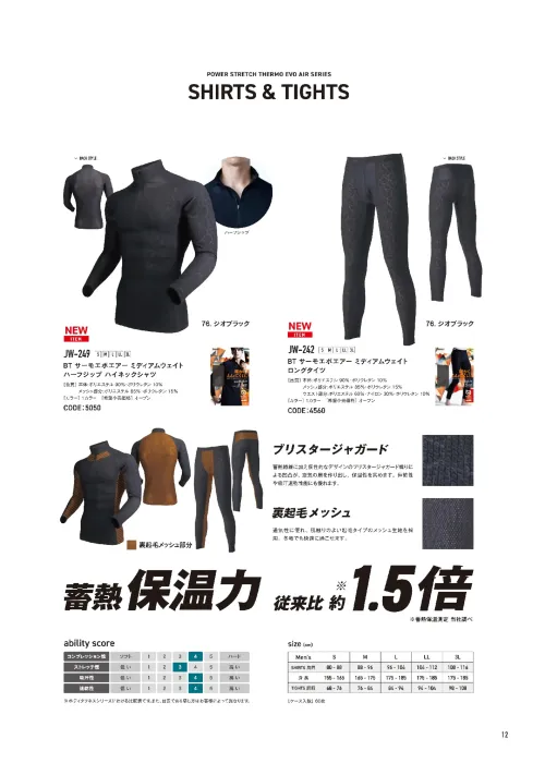 BT サーモエボエアー ミディアムウェイトハーフジップ ハイネックシャツ おたふく手袋JW-249のサイズ表